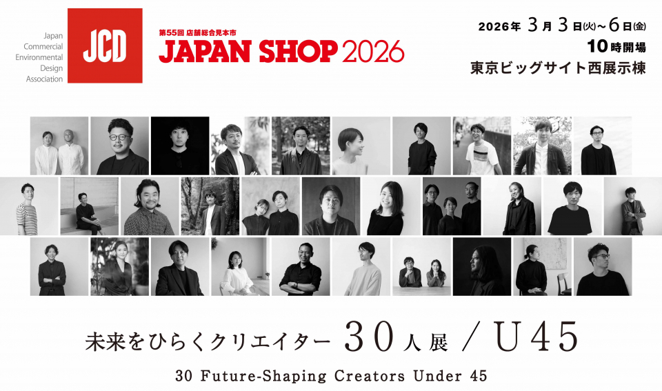 2026年3月3日(火)から6日(金)の4日間、東京ビッグサイト(東京都江東区)で開かれる第56回店舗総合見本市「JAPAN SHOP 2026」において、日本商環境デザイン協会(JCD)が企画・出展するブース「未来をひらくクリエイター30人展/U45」に、当社名古屋本部 クリエイティブ事業部の町田幹樹と、大阪本部 SD部の橋爪宏輔が参加し、トークイベントに登壇します。