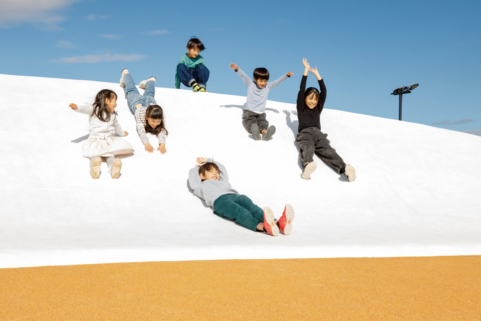 祖田 各務原の特産品であるニンジンにちなんで、子どもたちがユニークな滑り台「ニンジンスライダー」を提案してくれたことが印象に残っています。それを受けて、芝生ひろばにゆるやかな勾配のリボンスライダーが誕生しました。滑り降りた先にニンジン色を取り入れたゴムマット舗装を設え、各務原らしさを感じてもらえるよう工夫しています。