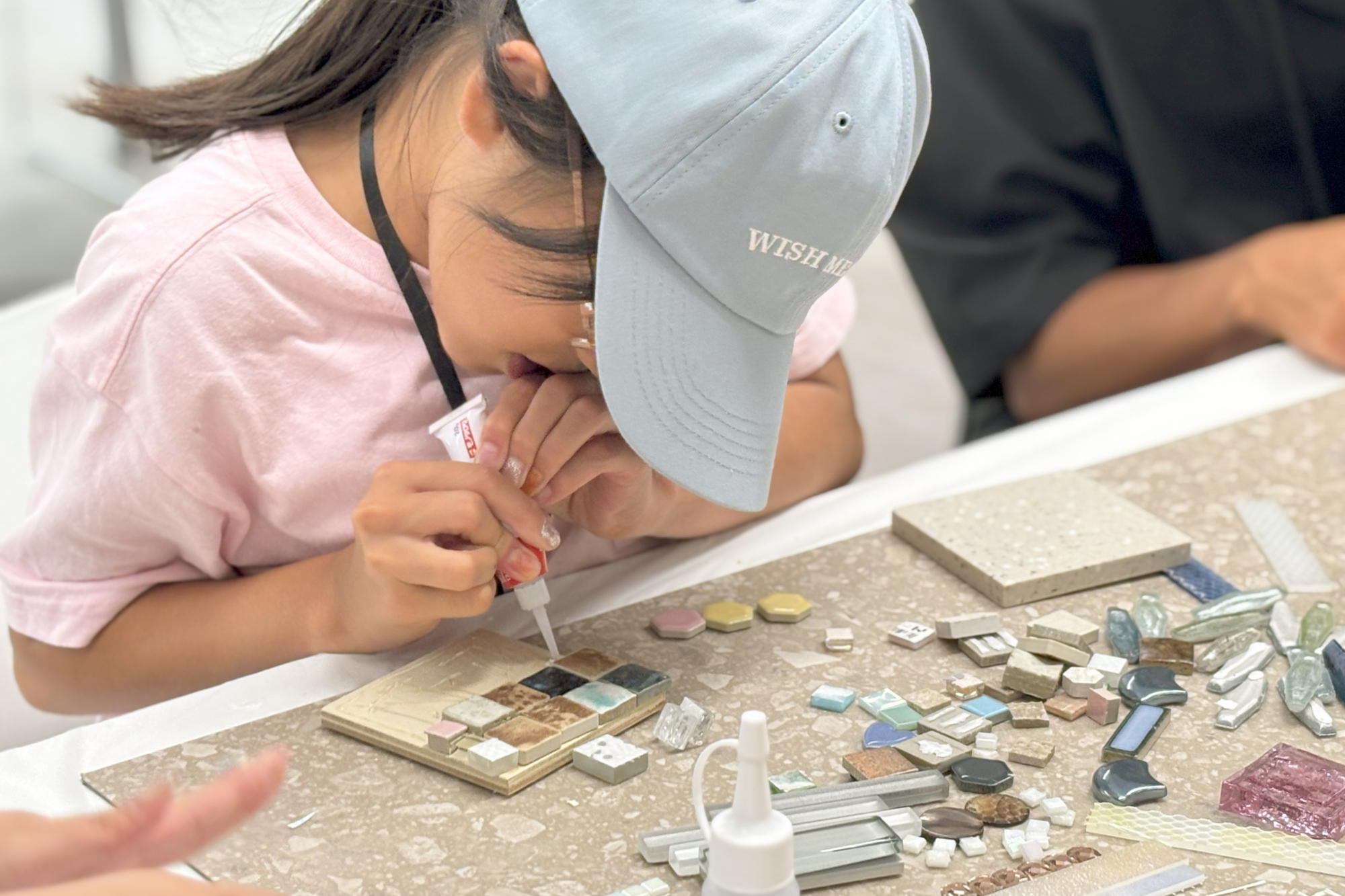 それを組み立て、そこに社内で不要になったタイルや壁紙サンプルを使ってデコレーションしてもらいました。