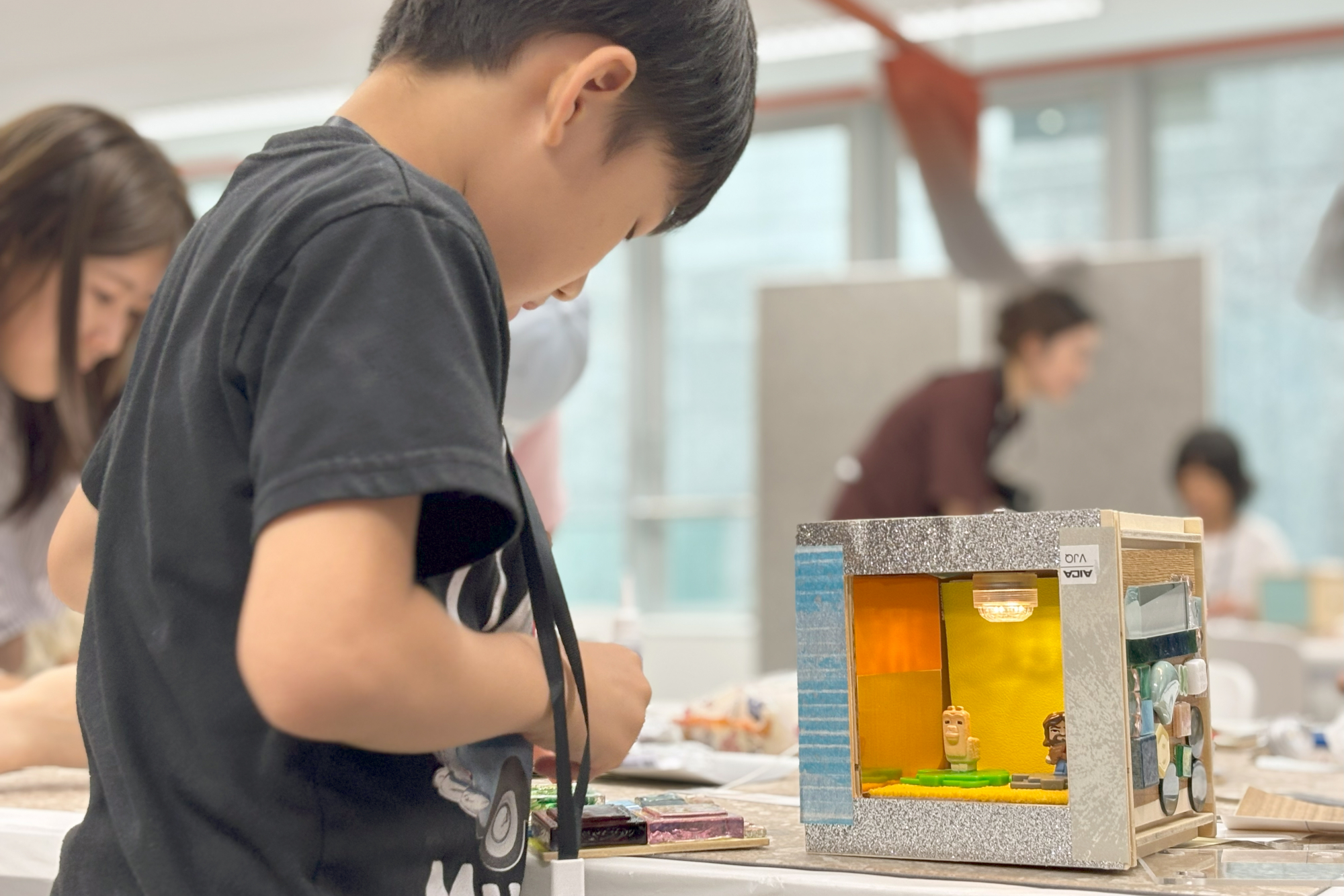 仕上げとして、“店内”に照明を設置し、持参したお気に入りキャラクターの人形を迎えて、思い思いのお店が完成しました。