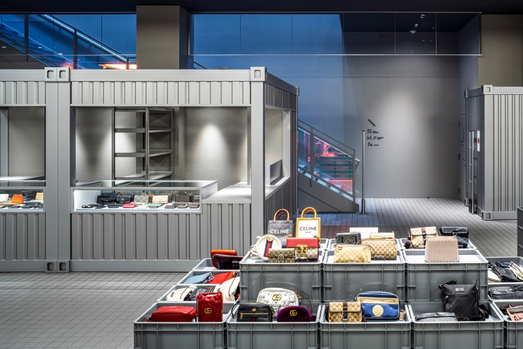 様々なブランドのバッグがコンテナに積み込まれ、お客様にお届けされる……というデザインテーマのもと、物流倉庫を彷彿とさせる空間で圧倒的な量のブランドが好奇心を掻き立てる「WAREHOUSE OF CURIOSITY “好奇心の倉庫”」をコンセプトに、アイコニックな表現で空間全体をまとめ上げています。