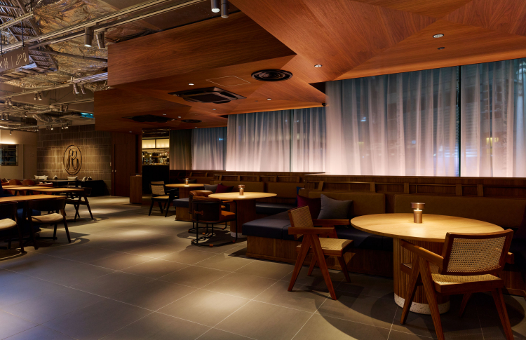 百貨店利用者、観光客、ビジネスワーカーなど多様な来訪者の過ごし方を想定した席配置を計画。カフェタイムとディナータイムそれぞれの利用シーンを楽しめるよう、光環境によって空間の表情を切り替えている。日中は、外光とフラットな光によって、開放感と高揚感を演出。夜は間接照明やペンダントライトの暖かい光によって、落ち着きと居心地の良さを感じられる空間とした。
