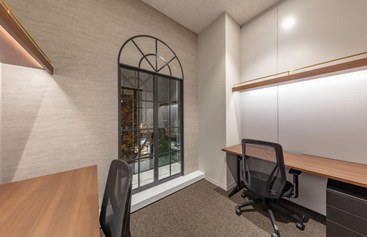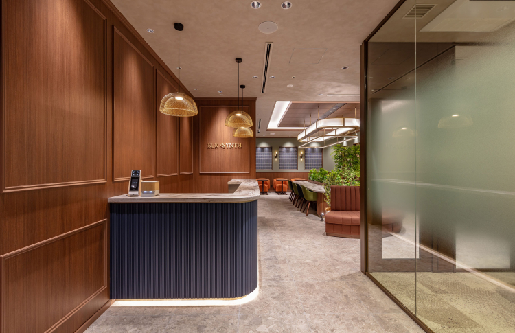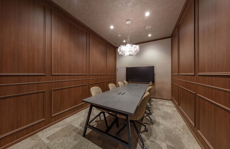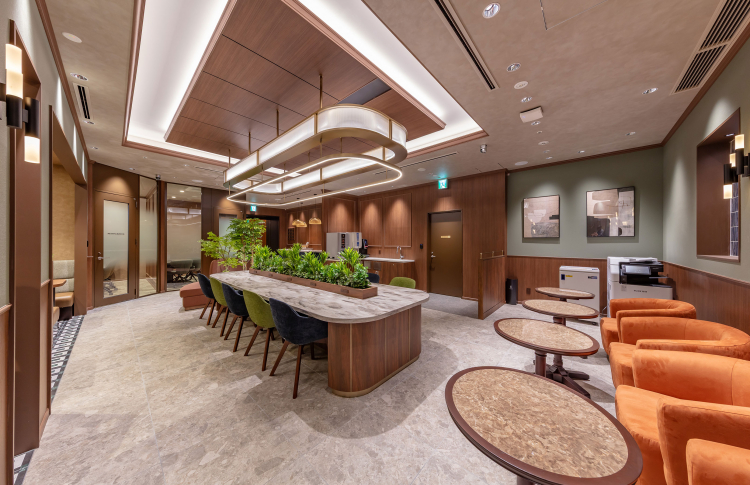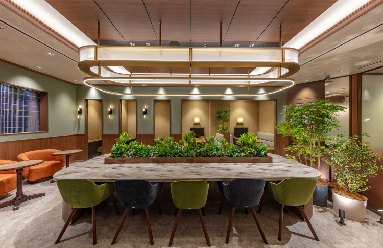 エントランスには植栽ウォールを設け、ラウンジには折上天井や意匠造作、植栽の陰影を際立たせる照明を取り入れるなど、視覚的な印象と心地よさを両立。外周部の個室は眺望を活かしたレイアウトとし、意匠性の高い家具計画により特別感のある執務環境を整えた。