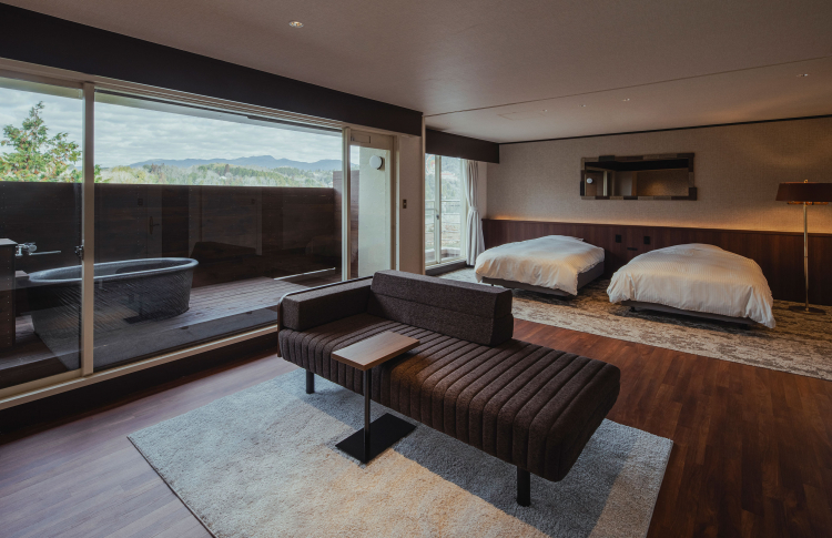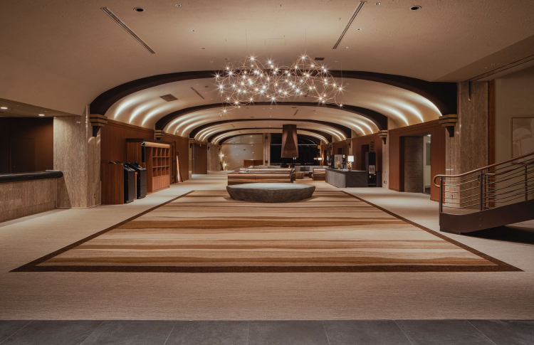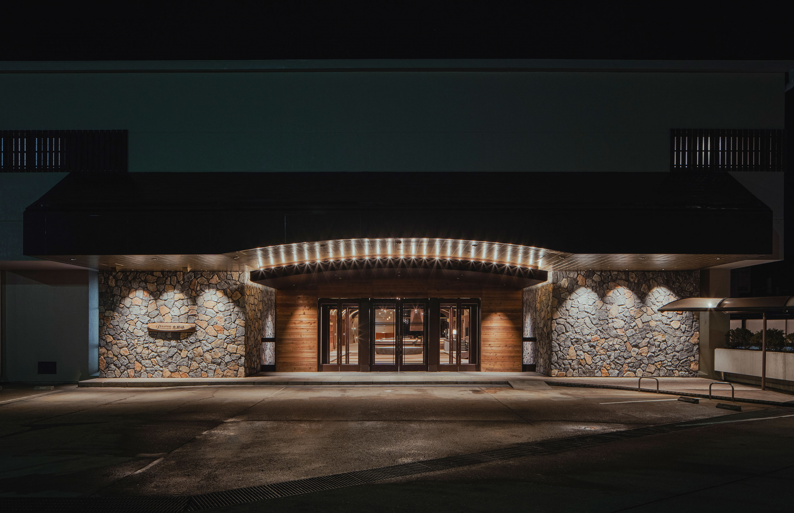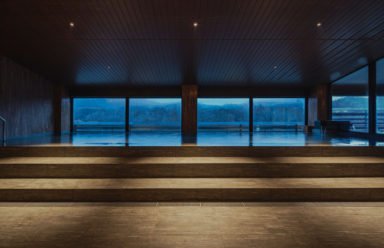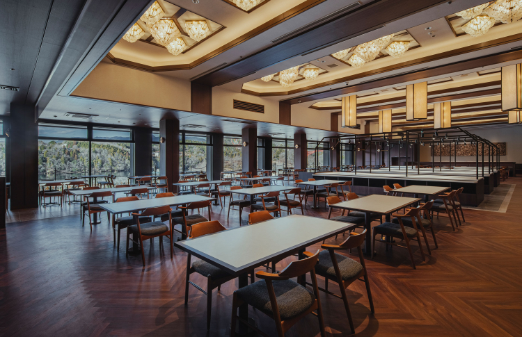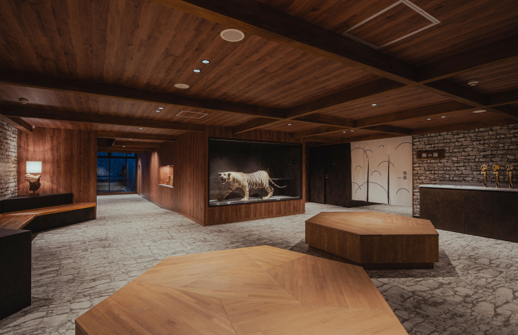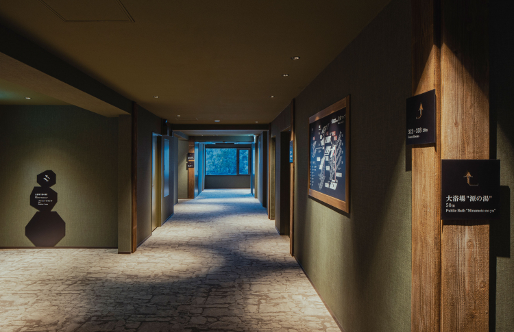 また、複雑化していた館全体の動線を整理し、サイン計画と通路デザインによって館内を巡る体験へと転換。山中を散策するような空間構成とすることで、温泉やラウンジといった滞在の目的が館内の移動と連続した体験として感じられるよう計画した。自然と建築が調和する“山岳の温泉宿”として新たな滞在価値の創出を図っている。