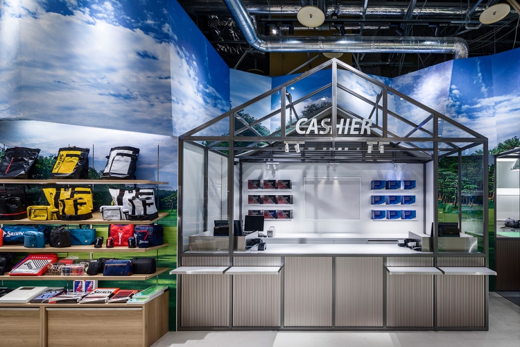 誰もがイメージできるゴルフ場の風景を店内に見立て着想した空間に、ゴルフコースのゾーニングを重ね合わせ「クラブ」「シューズ」などの売り場を配置しました。店内の大胆な構成の壁は、曲線を描きコースを歩くように自然な動線を誘発しています。高さを低く抑えた造作は目線を遮るものが少なく、「店員(人)」と「来店客(人)」とのコミュニケーションが容易に図れます。