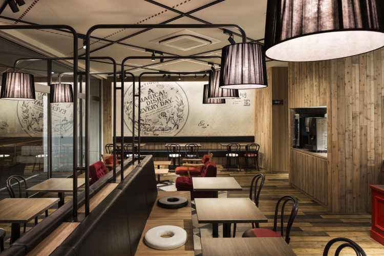 ショッピングセンターでの出店とは差別化を図り、地域に密着する路面店ではよりベーシックな“パン屋さん”をイメージするつくりとなっています。木質の温かみある素材感とプロダクト製品のもつ無骨な表情で空間を構成し、メリハリをつけた色使いや商品との距離感をコントロールして、シンプルさを際立たせた表現としています。
