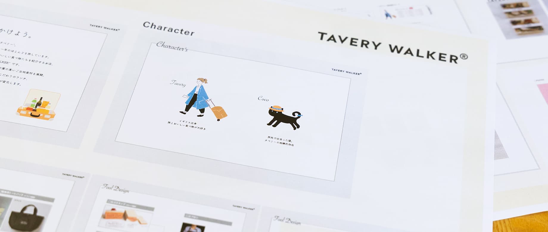 タベリーちゃんの企画資料と、実際のパネル・グッズ。