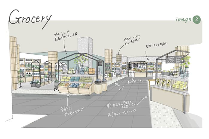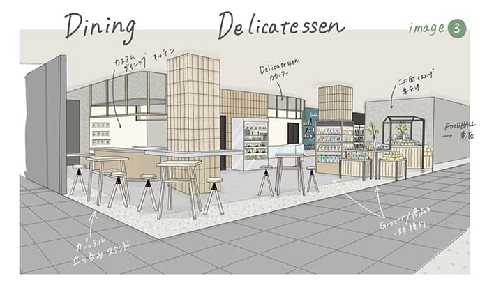 吉村:「チームで最も話し合ったのは、レストランが入るデリカ&バルゾーンとグローサリーゾーンを、いかに一体的に見せるかです。見た目のデザインだけでなく、人の流れが分断されないような動線設計も含めて工夫を凝らしています」